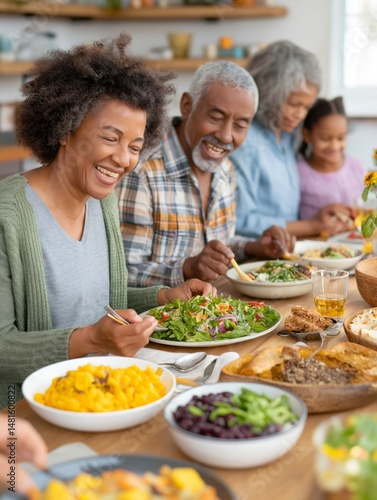 Family members gather around a table filled with vibrant Korean dishes, enjoying a multicultural dinner. The atmosphere is warm, filled with laughter and a sense of togetherness