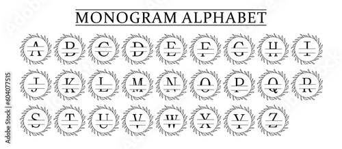 family Monogram letter A-Z, Set of Split alphabet for monogram. Monogram alphabet. illustration for wedding invitation. Set of initial with decorative plant frame and text space