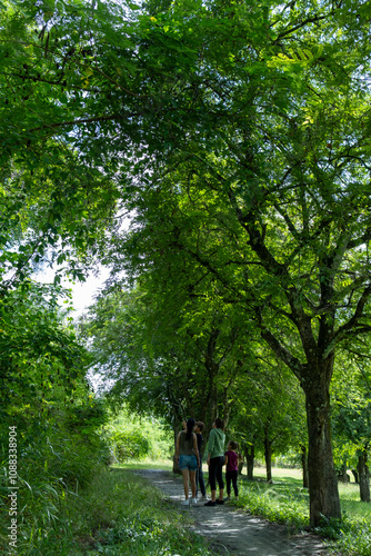 Family of 2 LGBT women and their young children enjoy a walk in the woods on vacation, walk in the forest