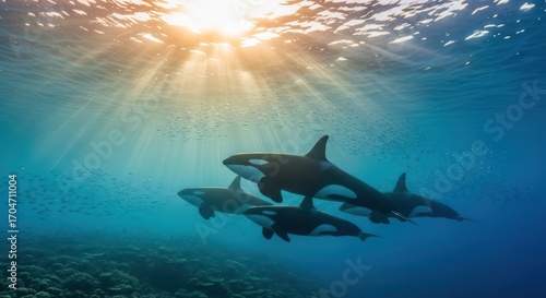 Family of Orcas swimming together in the deep blue ocean as sun rays penetrate the surface of the
