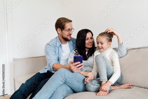 Family on sofa laughs at something on phone screen, showing tech use that supports bonding, positive emotional energy, and balanced media integration at home.