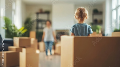 Family packing boxes for moving in spacious living room