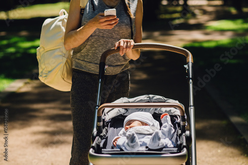 Family, parenthood, technology and people concept - young stylish sporty mother with backpack walking with baby stroller and looking in smartphone in sunny summer day at green park.
