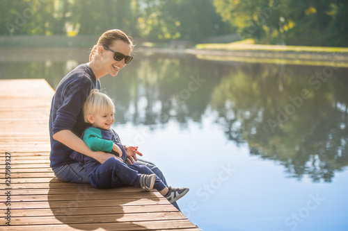 Family, parenting Happy smiling mother and son sitting on a wooden dock lake side.