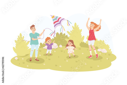 Family Playing Kite with Children on Green Meadow in Park Vector Illustration