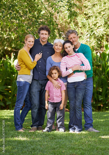 Family, portrait and hug in outdoor park, love and bonding together or happy in backyard. Generations, smile and peace or embrace for support in garden or care, vacation and summer holiday in France