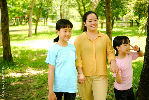 Family portrait background of Asian women standing, holding hands, showing their faces having fun in the field.