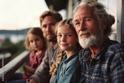 Family portrait featuring a smiling girl with braided hair, an elderly man with a beard, a young man, and a young girl, sitting together on a wooden porch during sunset