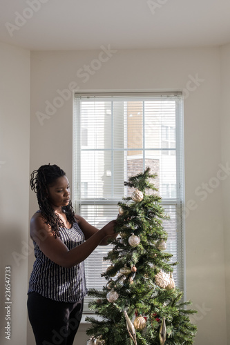 Family putting up a Christmas tree