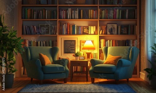 Family reading corner with comfy chairs, bookshelves, and soft lighting,