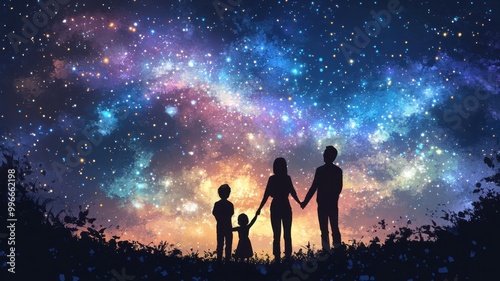 Family silhouettes gazing at a vibrant starry sky with colorful galaxies.
