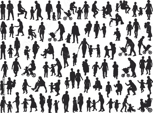 Family silhouettes, parents with children, holding hands, walking together, kids playing, strollers, diverse family group, parent-child bonding, outdoor activity, love, unity, black isolated figures