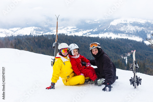 Family ski vacation, family sitting on the top of mountain slope with ski