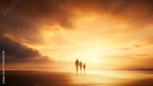 Family stroll on a serene beach at sunset, embraced by warm golden hues, creating lasting memories together.
