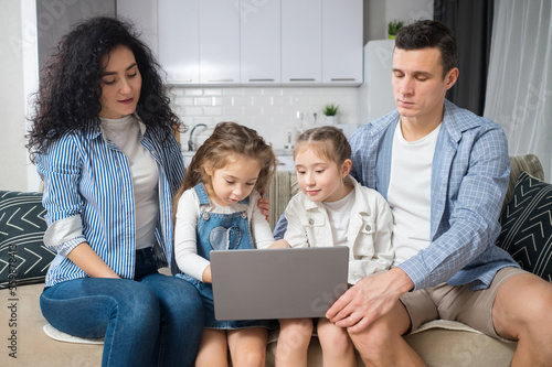 Family talks with grandparents on video call and discuss domestic life issues on laptop. Parents and girl kids enjoy talking with relatives using modern device