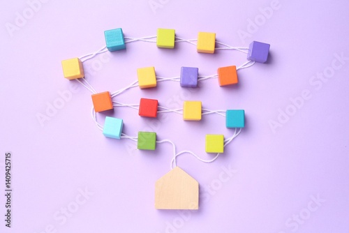 Family tree made with colorful cubes and house figure on lilac background, top view