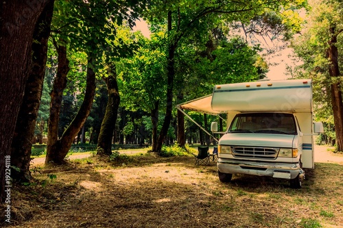 Family trip in motorhome in forest or park in South Chile