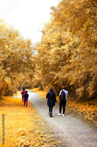 Family (two women and two girls) walking in a park in autumn. Oromana Park, Alcalá de Guadaira, Seville, Spain