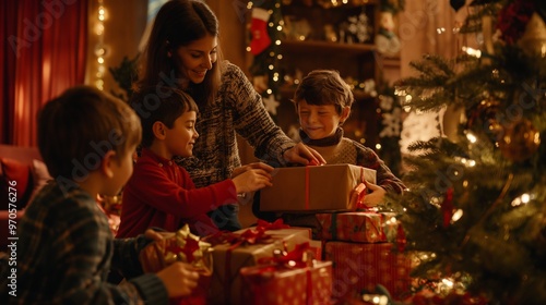 Family unwrapping christmas and new year presents by a tree, creating a cozy, magical atmosphere. A mother with three little boys kids