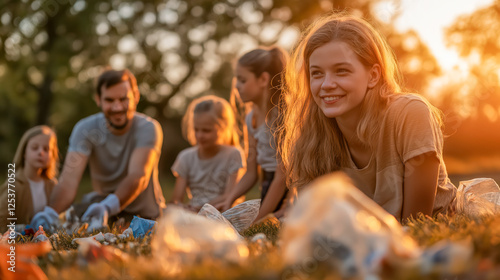 Family volunteers cleaning up park; promotes environmental stewardship, community action.