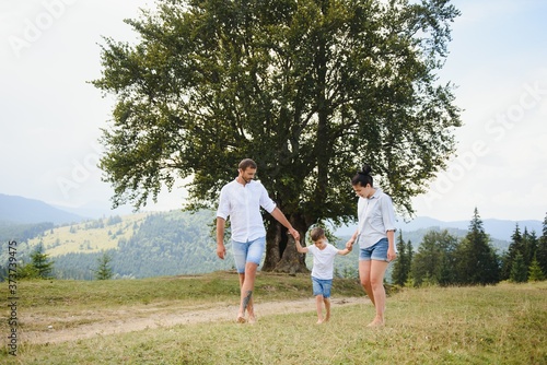 family walk on the field near the mountains in sunny day yellow grass father mother son holding hands on the sunset