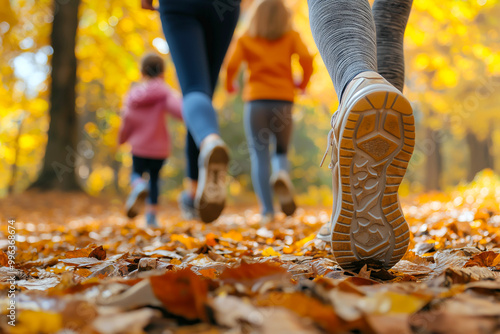 Family walking in autumn park. Tourists walking in the autumn forest. Feet close-up. Traveling, family vacations and fall seasonal holidays concept
