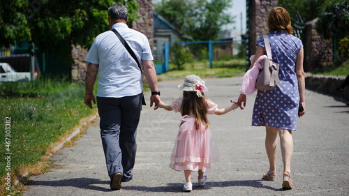 family walking in the park. mom dad and little girl walking holding hands. back view. daughter in a pink dress. friendly loving family concept, love. outdoor, walk in the fresh air, threesome