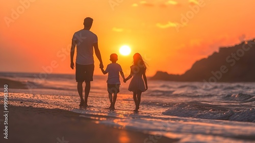 Family walking on the beach at sunset, enjoying quality time together.