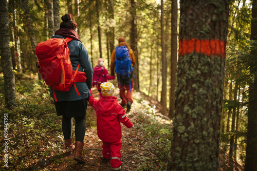 Family walking through forest, Sweden
