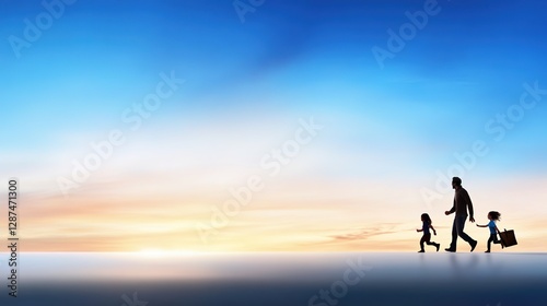 Family Walking Together at Sunset in a Serene Landscape Scene
