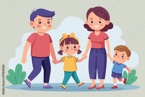 Family walking together in a colorful park during a sunny day with children enjoying their time