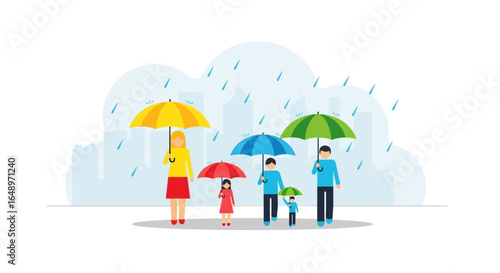 Family With Umbrellas Enjoying a Rainy Day Cityscape Background