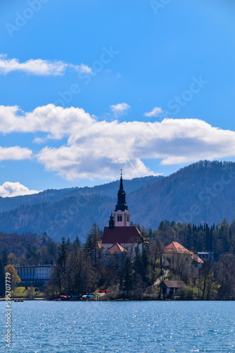 Famous alpine Bled lake (Blejsko jezero) in Slovenia, amazing autumn landscape. Scenic view of the lake, island with church, Bled castle, mountains and blue sky with clouds, outdoor travel background