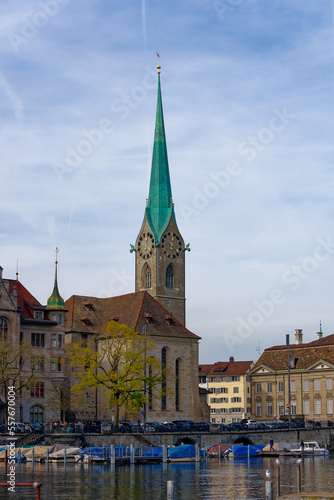 Famous church Women's Minster at the medieval old town of Zürich on a blue cloudy autumn day. Photo taken October 30th, 2022, Zurich, Switzerland.