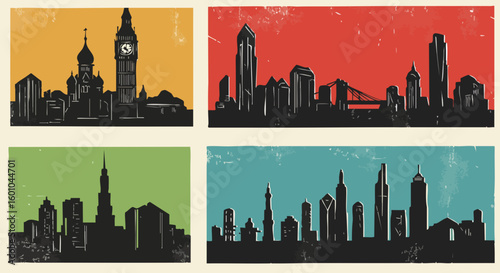 Famous City Skylines Silhouette Collection Retro Vector Style