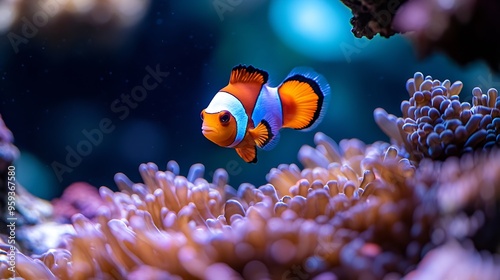 famous ocellaris clownfish healthy and active animal in soft corals nano reef marine aquarium expensive hobby for experienced aquarist LED actinic blue low light beautiful blurred back : Generative AI