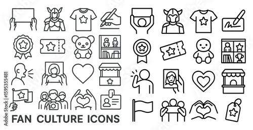 Fan culture icons are shown in a black and white style. The icons include a teddy bear, a person holding a sign, a person holding a flag, and a person holding a book