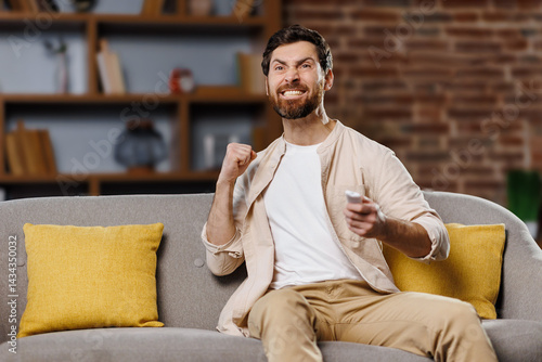 fan watching game, celebrating victory, Excited friends watching TV, man sits on a comfortable couch, fists raised in triumph while watching an intense sports game. The cozy living room features warm