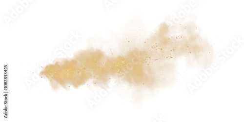 Fantastic golden smoke background. Magic golden smoke with glitter and small particles of twinkling stars. Fog with luminous particles. Yellow vapor with stardust. Morning fog over land or water surfa