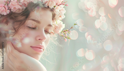 Fantastic Young woman with wreath from flowers and bokeh