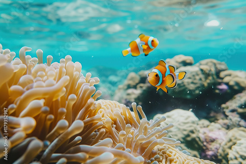Fantastically beautiful bright clownfish swims in deep sea among color corals, abstract vivid composition consists of fictional unreal fantastic vision on background