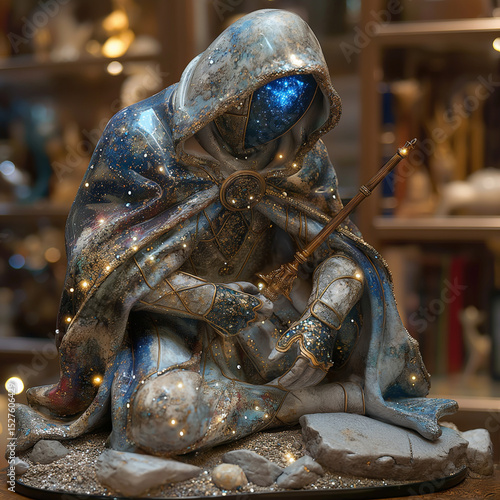 Fantasy cosmic knight kneeling with glowing sword and starry cloak