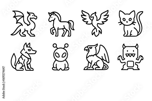 Fantasy Creature Icons. Outline icon set of fantasy digital creatures: dragon, unicorn, phoenix, fairy cat,
