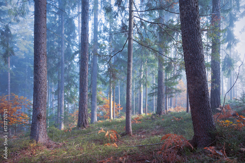 Fantasy fall season foggy forest landscape with morning sunlight.
