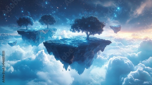 Fantasy Floating Islands with Trees and Stars in the Sky