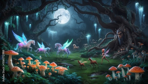 Fantasy forest with glowing mushrooms and mystical creatures. Created with generative AI technology