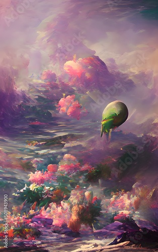 Fantasy forest with oasis, tropical leaves, flowers, stone mountain. Art illustration.