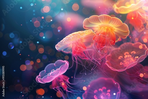 Fantasy Glowing Jellyfish, Bright Underwater Creature, Abstract Jelly Fish, Neon Animals