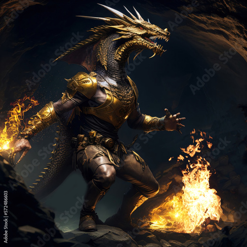 Fantasy Humanoid Dragon Wearing Armor Standing in a Firey Cave Anthropomorphic Generative AI Illustration