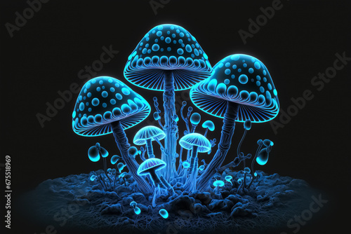 Fantasy illustration of neon color glowing magic mushrooms. Psychedelic background.